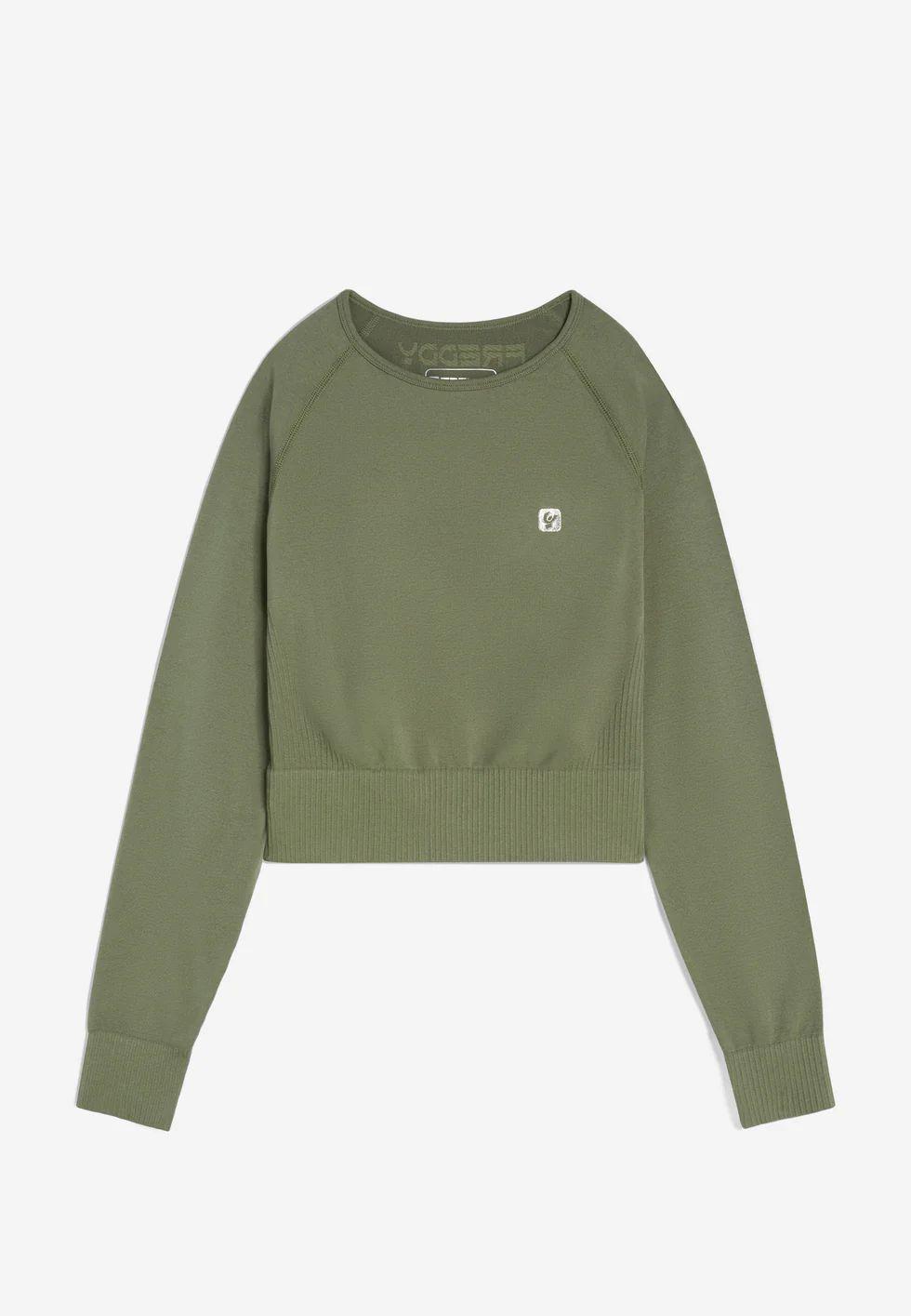 Top corto in vita con maniche lunghe in tessuto seamless realizzato in poliammide elasticizzato, ecosostenibile perché ottenuto per il 60% da materiali riciclati.