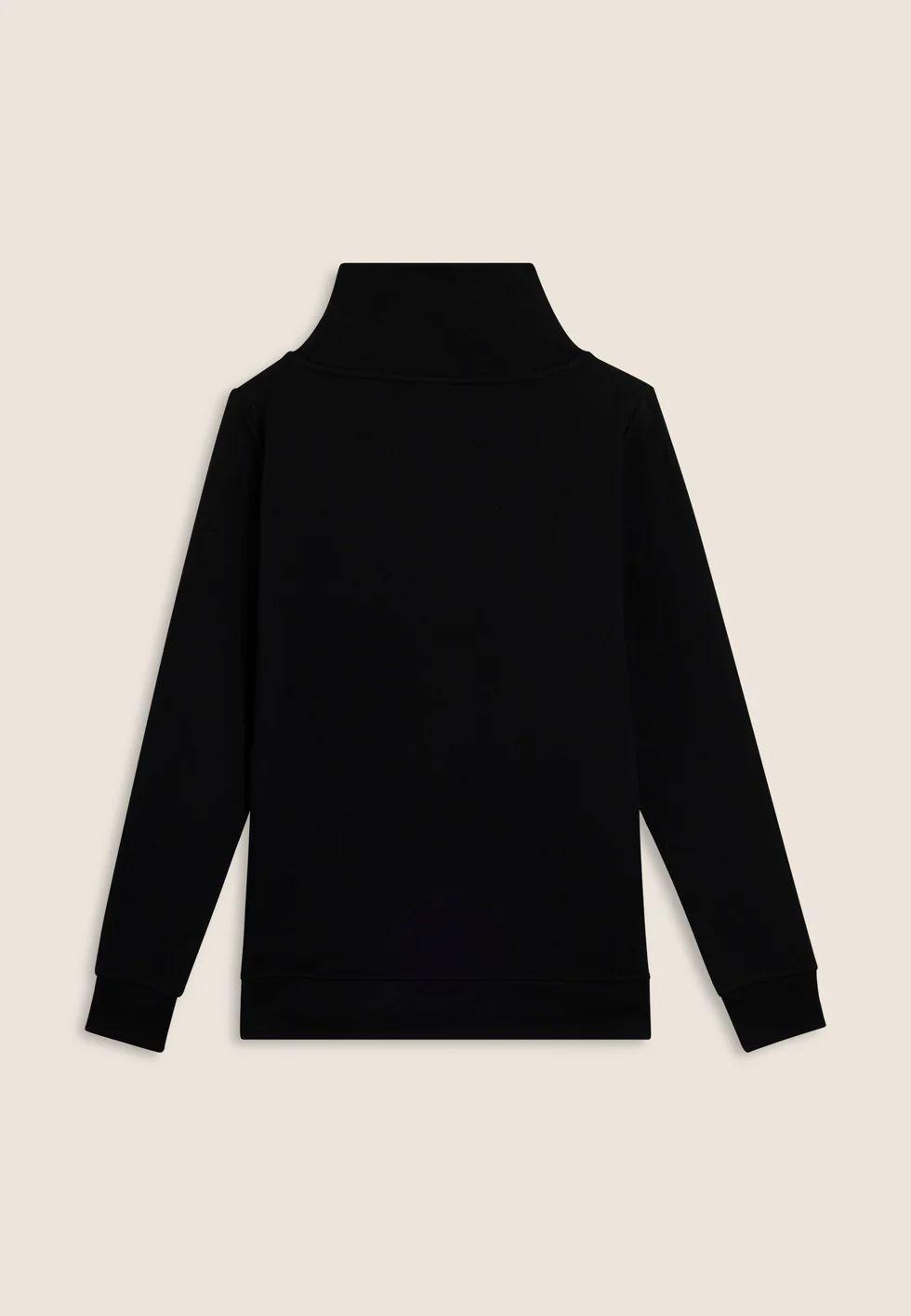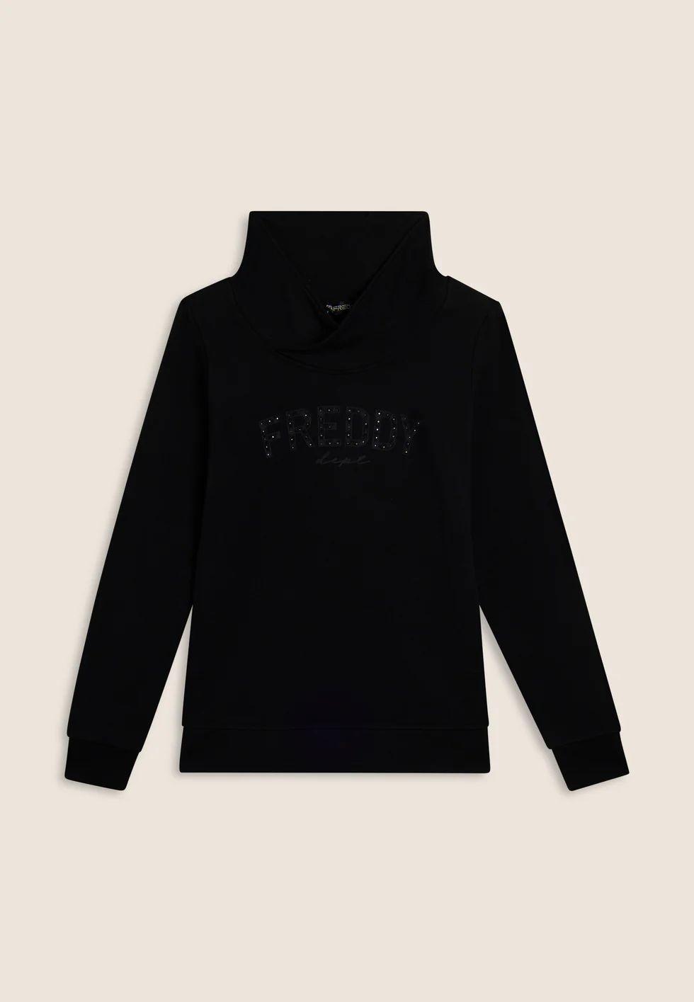 Felpa sportiva da donna in felpa garzata elasticizzata con vestibilità regular e fondo dritto con spacchi laterali. La parte posteriore è più lunga e rifinita all’interno con tessuto a fantasia geometrica, visibile nei movimenti. Il collo incrociato alto, le maniche lunghe con polsini in costina e il grande logo FREDDY in borchie sul fronte aggiungono stile e carattere. Il capo è privo di tasche.