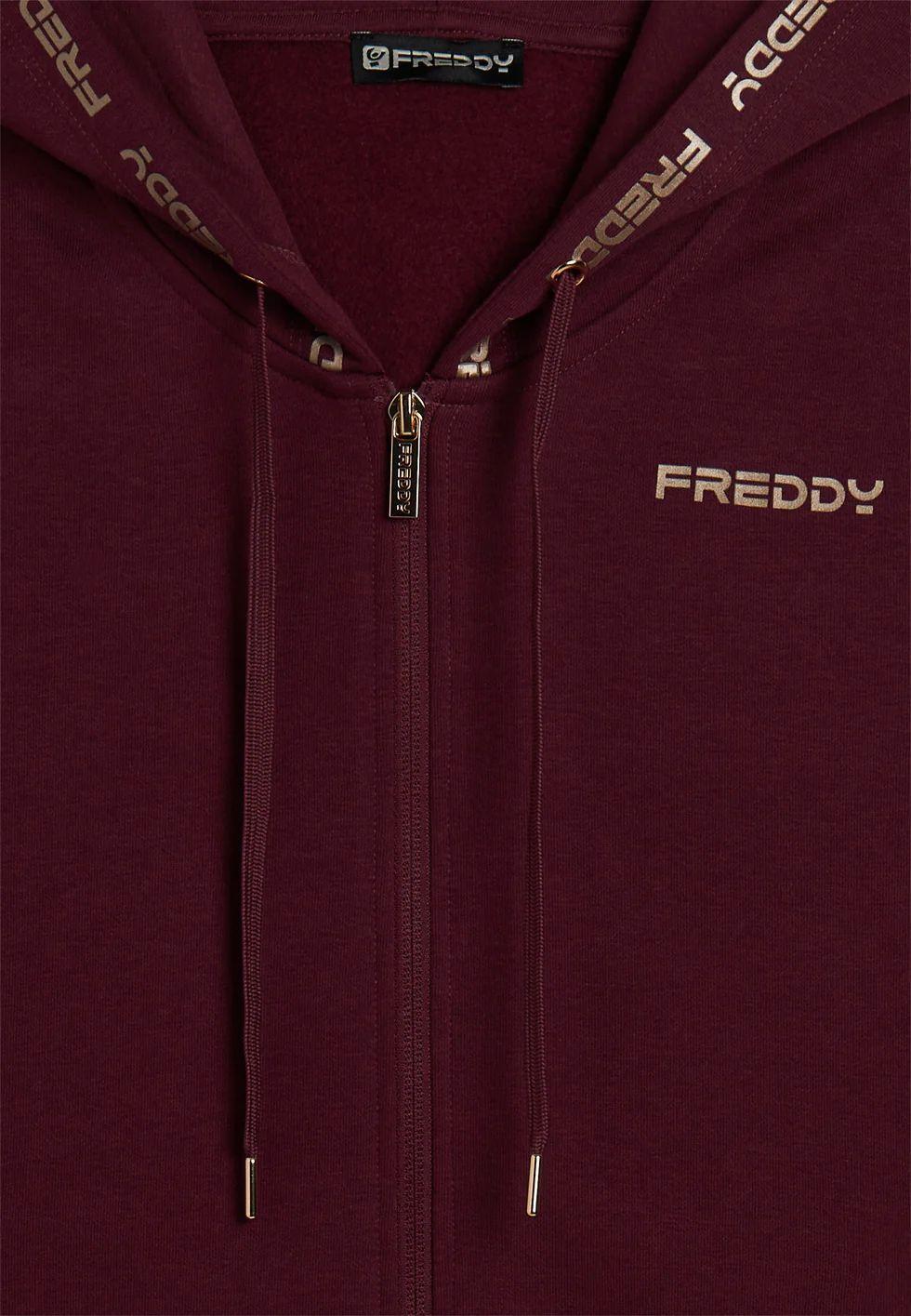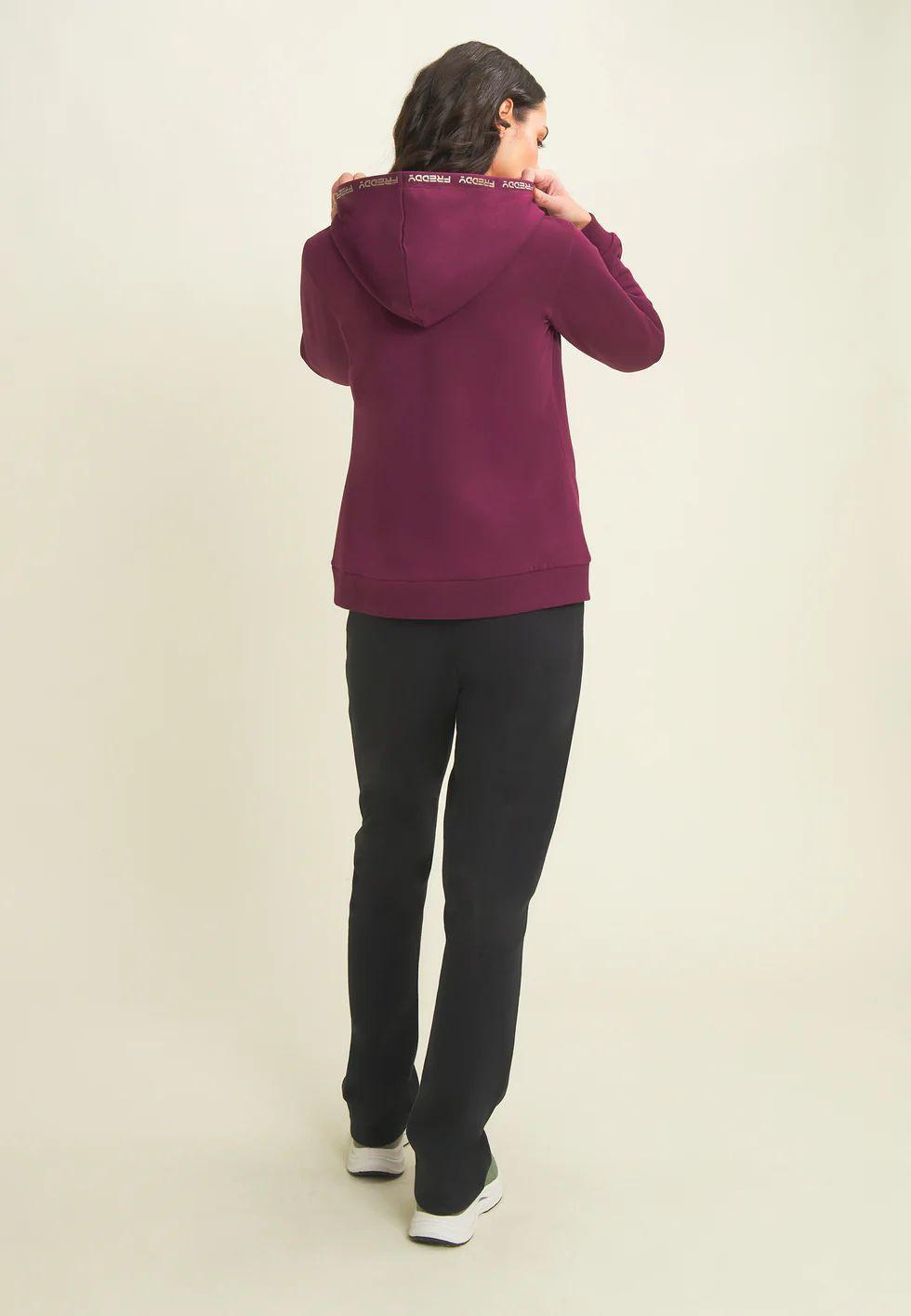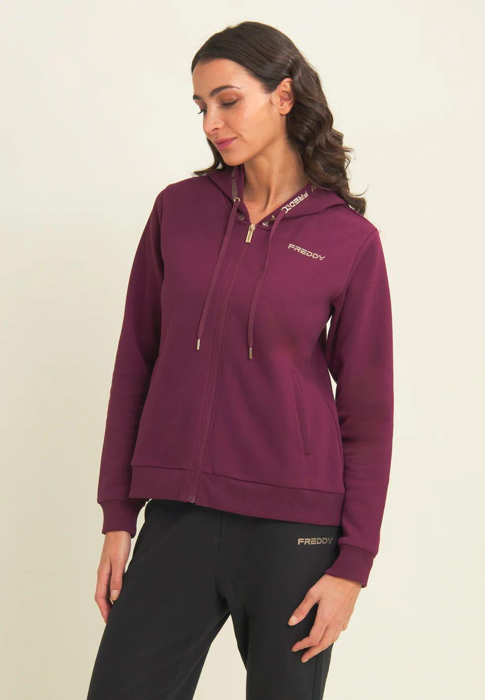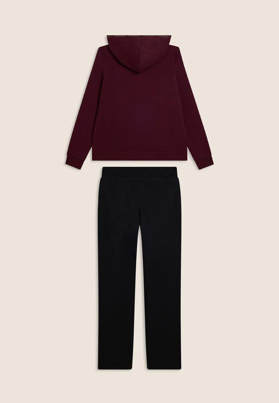 Realizzata in felpa garzata elasticizzata, questa tuta ha un look sportivo e luminoso. La felpa con zip e fascia in costina è completata da un cappuccio regolabile con coulisse, foderato in morbido jersey. Le maniche lunghe hanno polsini in costina per una migliore aderenza. I pantaloni presentano gamba dritta, vita in costina con coulisse e una vestibilità comoda. Il logo Freddy color oro decora con eleganza il bordo del cappuccio, il cuore e il fianco sinistro dei pantaloni. La felpa è dotata di tasche interne pratiche e discrete.