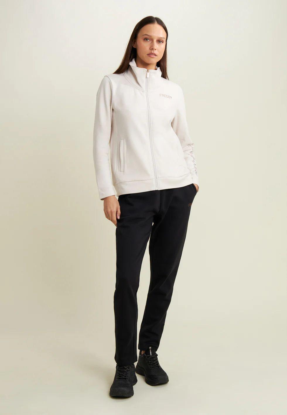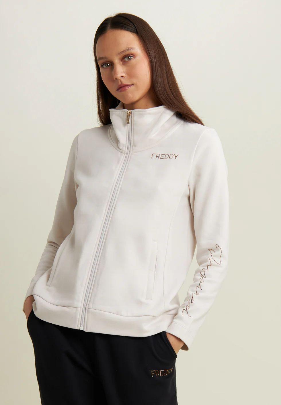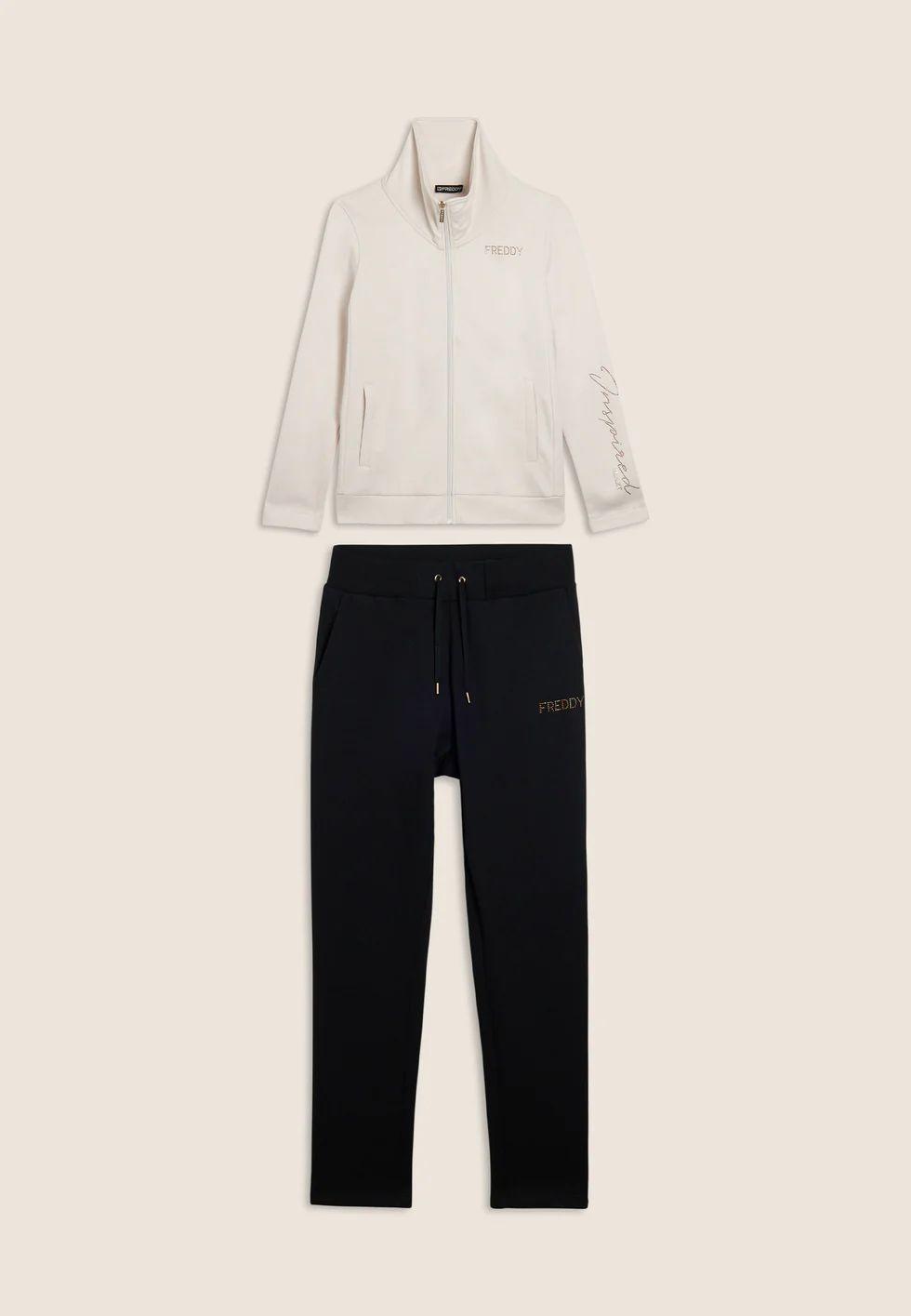 Questa tuta in felpa garzata elasticizzata è pensata per chi cerca il giusto equilibrio tra performance e dettagli femminili. La felpa presenta una chiusura full zip, collo alto, maniche lunghe con polsini e fascia sul fondo. Sulla manica sinistra spicca la scritta “Inspired Heart” composta da strass, che si abbina al logo Freddy decorato su cuore e pantalone. I pantaloni, con gamba dritta e coulisse in vita, sono dotati di tasche alla francese. La felpa invece include tasche a filetto, pratiche ma discrete.