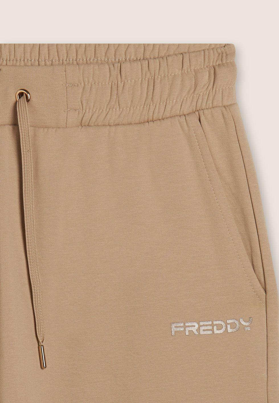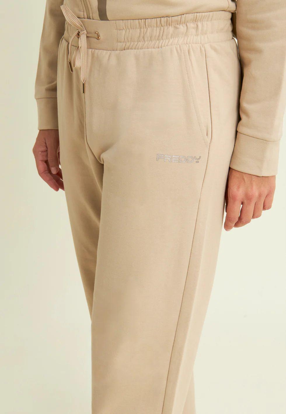 Pantaloni donna in felpa garzata elasticizzata con vestibilità regular e gamba dritta. Vita regular con elastico interno e coulisse per una regolazione comoda. Il modello è completato da tasche alla francese e piccolo logo FREDDY stampato sul fianco sinistro.