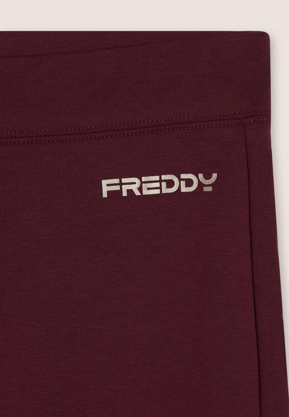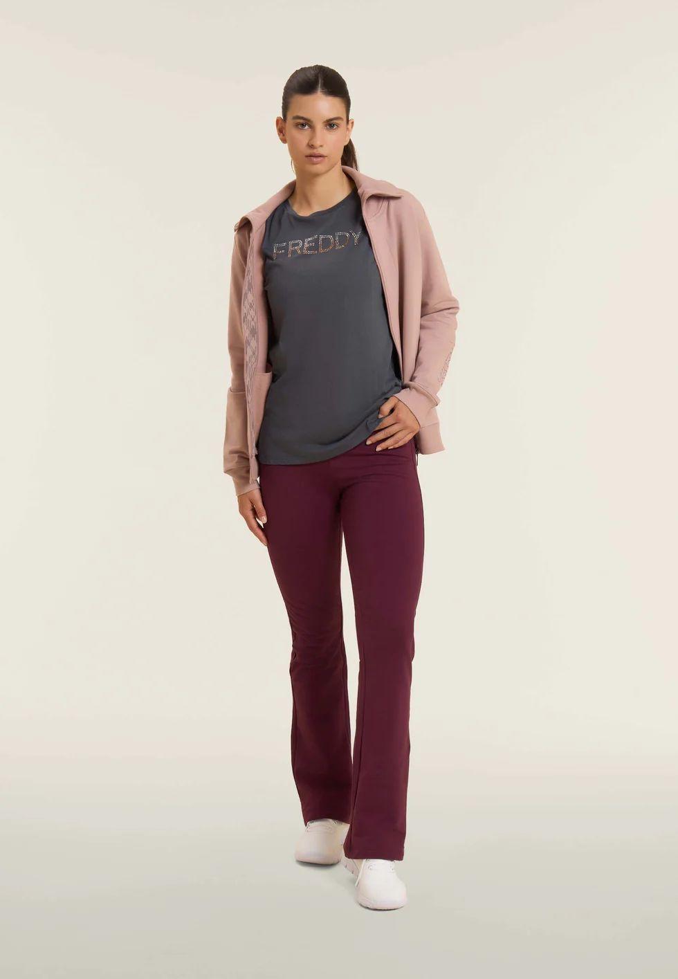 Leggings dal fondo leggermente svasato in felpa garzata elasticizzata. Vestibilità aderente e lunghezza regular con vita regular ed elastico interno. Il logo FREDDY è stampato sul fianco sinistro. Privi di tasche.