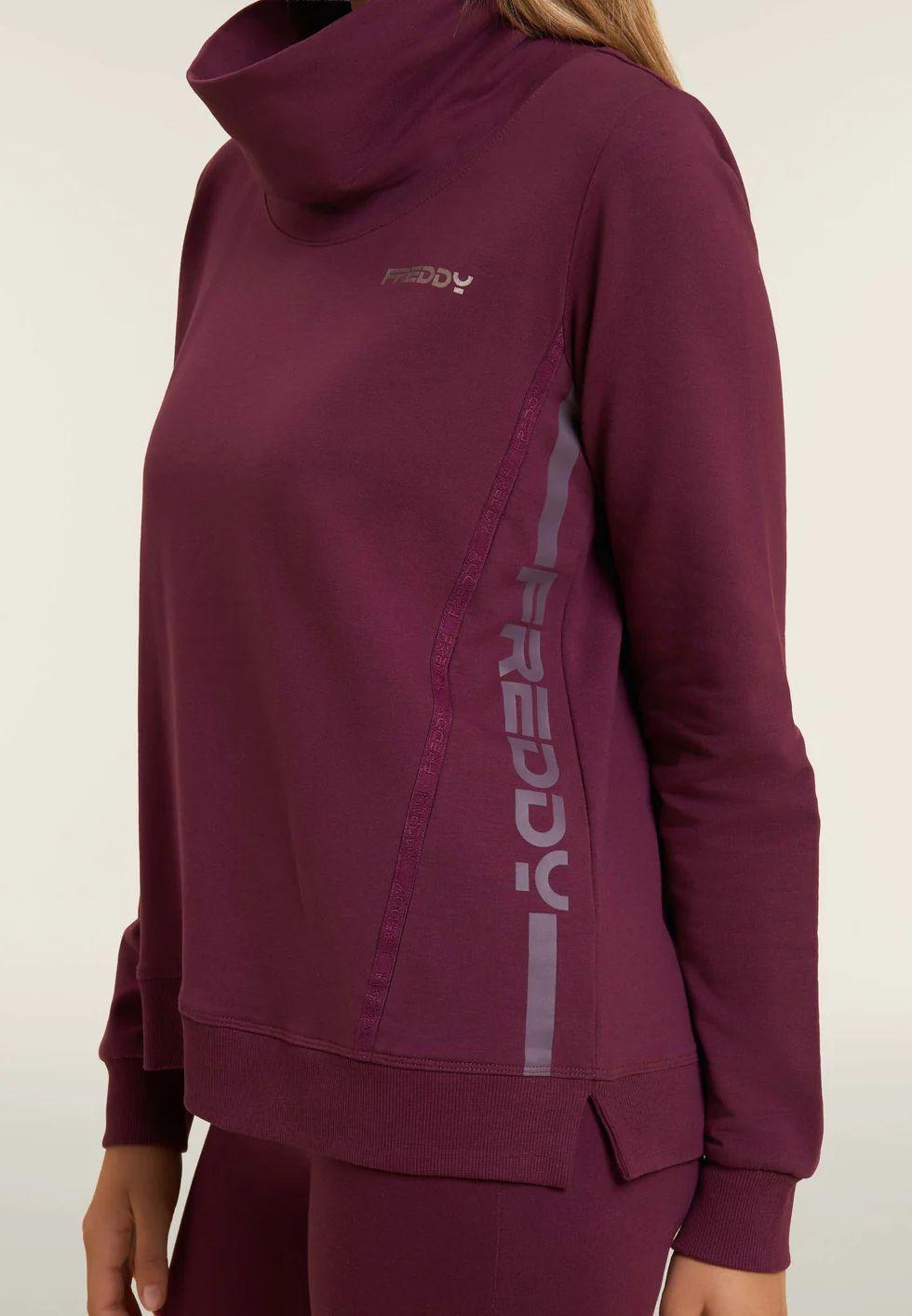 Dal design contemporaneo, questa felpa da donna in felpa garzata elasticizzata ha una vestibilità comfort. Il collo alto morbido e i polsini in costina garantiscono calore e libertà. La grafica logata sui fianchi segue l’inserto in jacquard lungo cuciture oblique del busto, per un effetto visivo dinamico. Il piccolo logo FREDDY sul cuore completa il capo. Fondo con spacchi laterali.