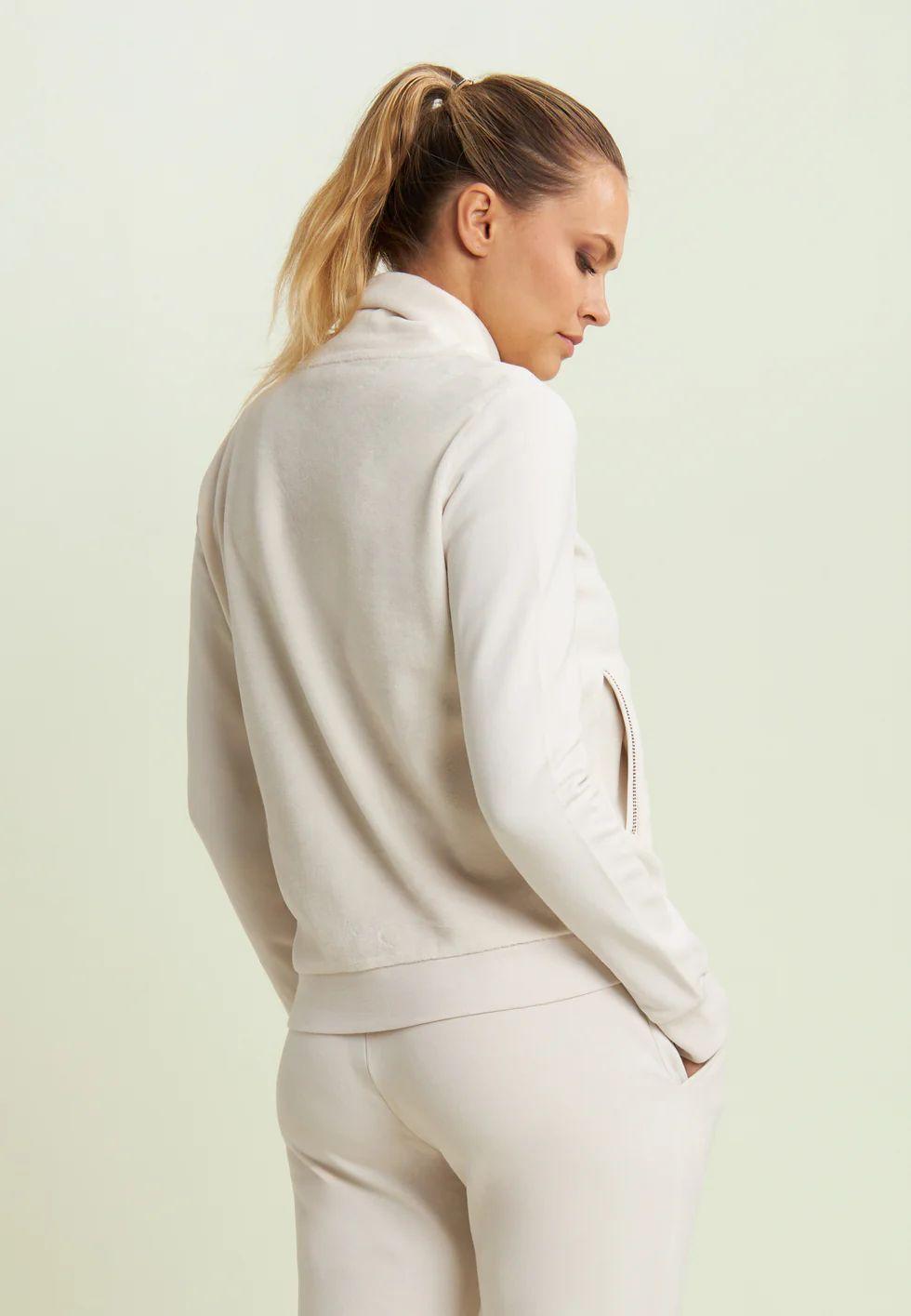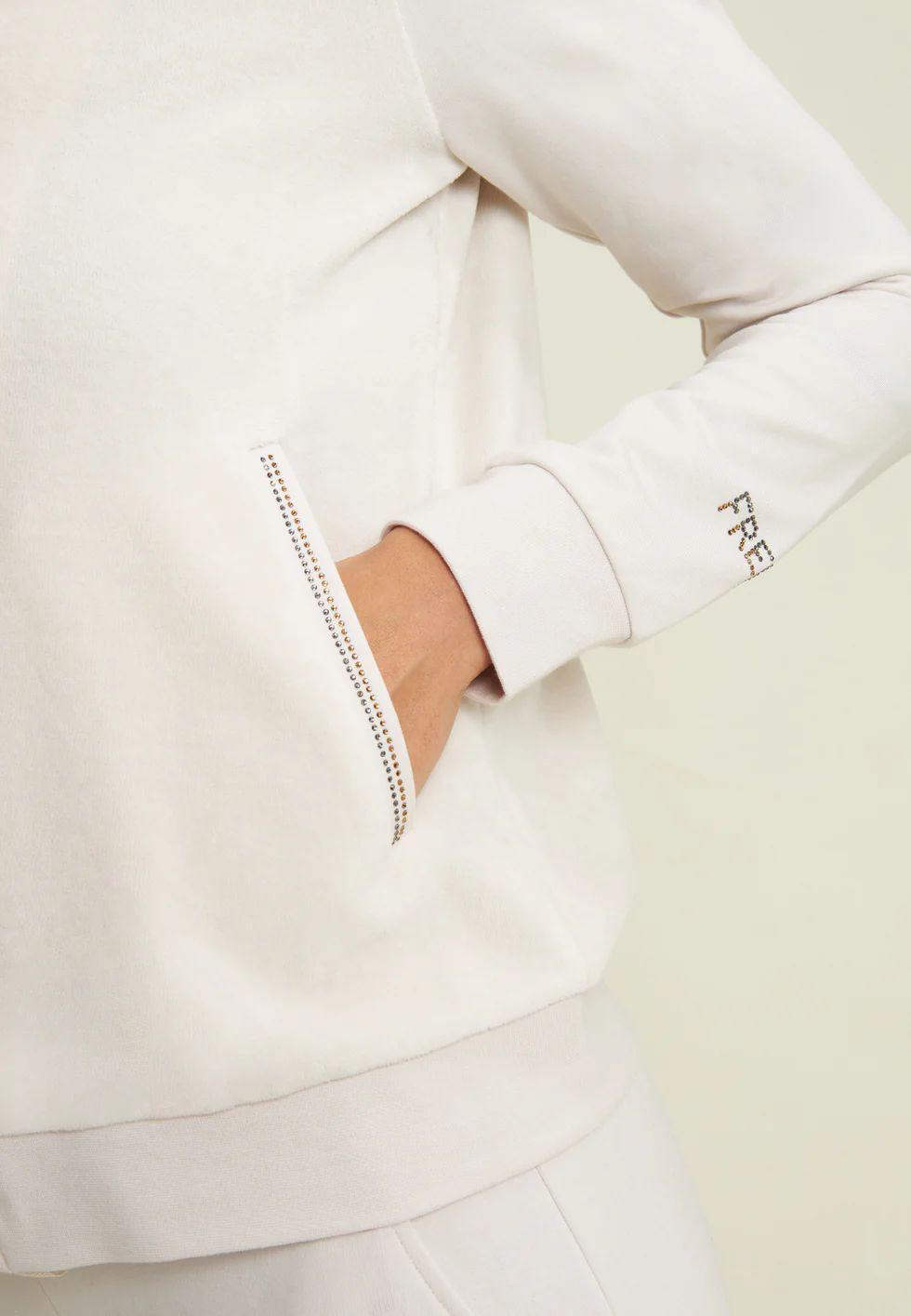 Questa felpa sportiva da donna combina velluto morbido e maniche in felpa modal garzata, per un effetto avvolgente e ricercato. Ha vestibilità regolare, chiusura full-zip e collo alto ampio. Gli strass bicolori impreziosiscono il fondo manica sinistro e l’apertura delle tasche a filetto.