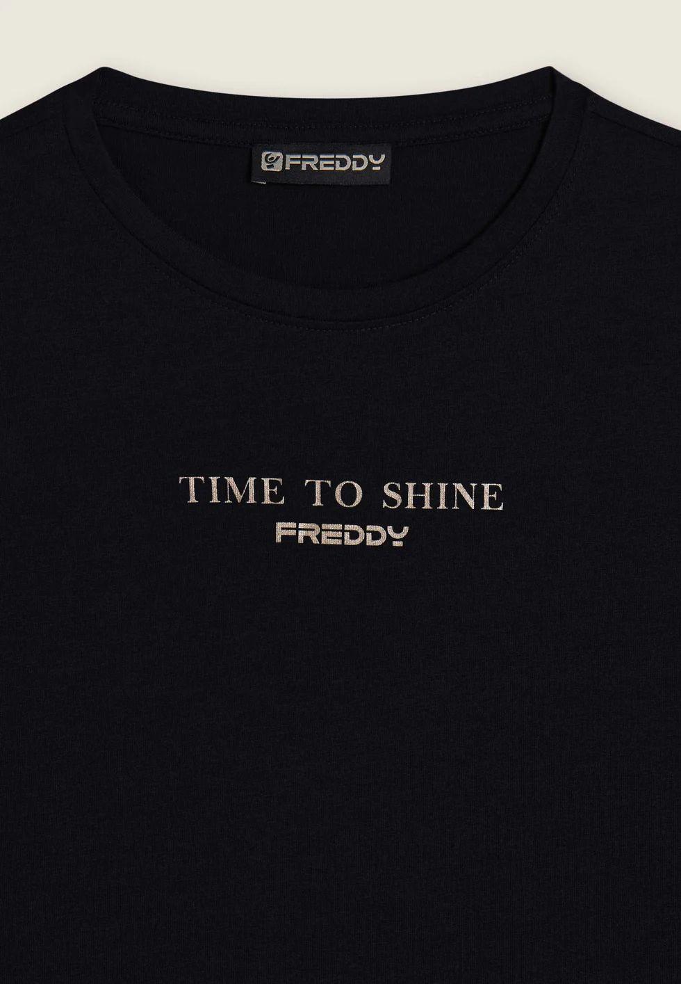 Modello da donna in jersey leggero con vestibilità comfort. Il fondo è dritto, lo scollo rotondo e le maniche corte. La stampa frontale presenta logo FREDDY e lo slogan “Time to Shine” in una grafica dorata discreta ma distintiva.