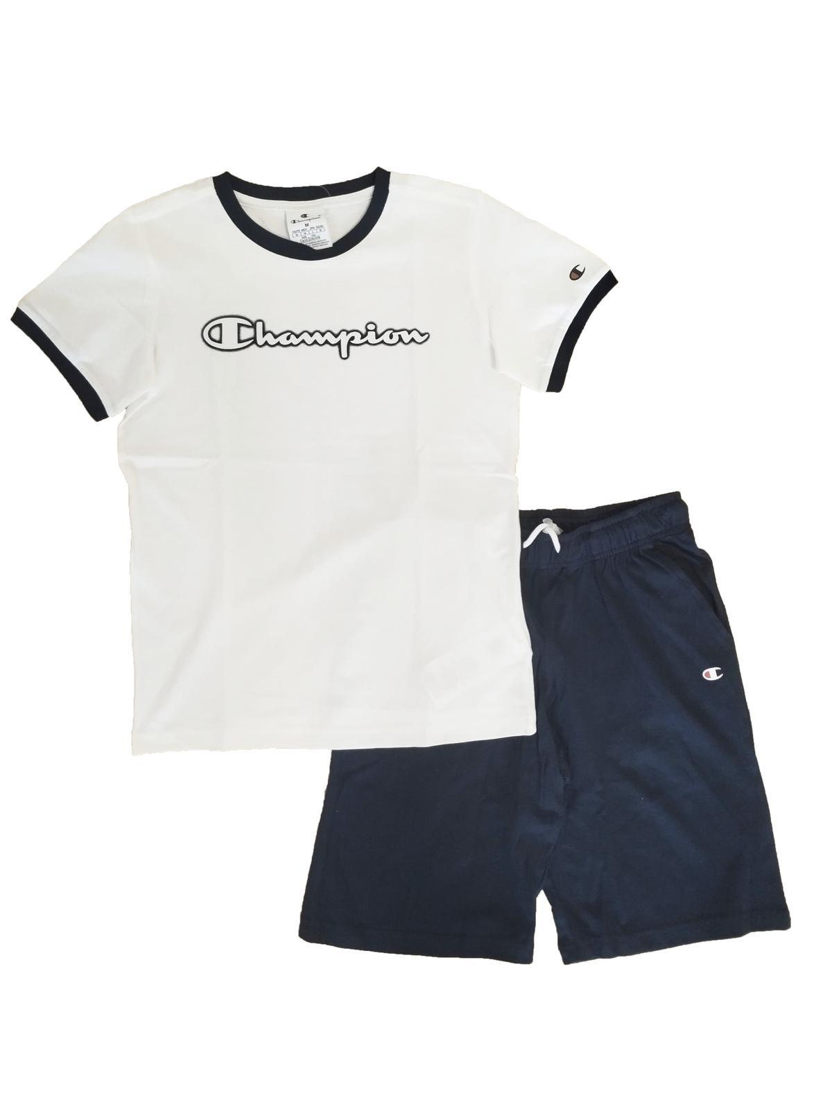Un set sportivo firmato Champion composto da una t-shirt con logo stampato sul petto e un paio di pantaloncini con coulisse regolabile e logo stampato.