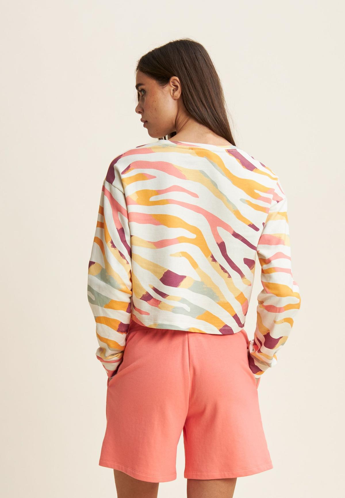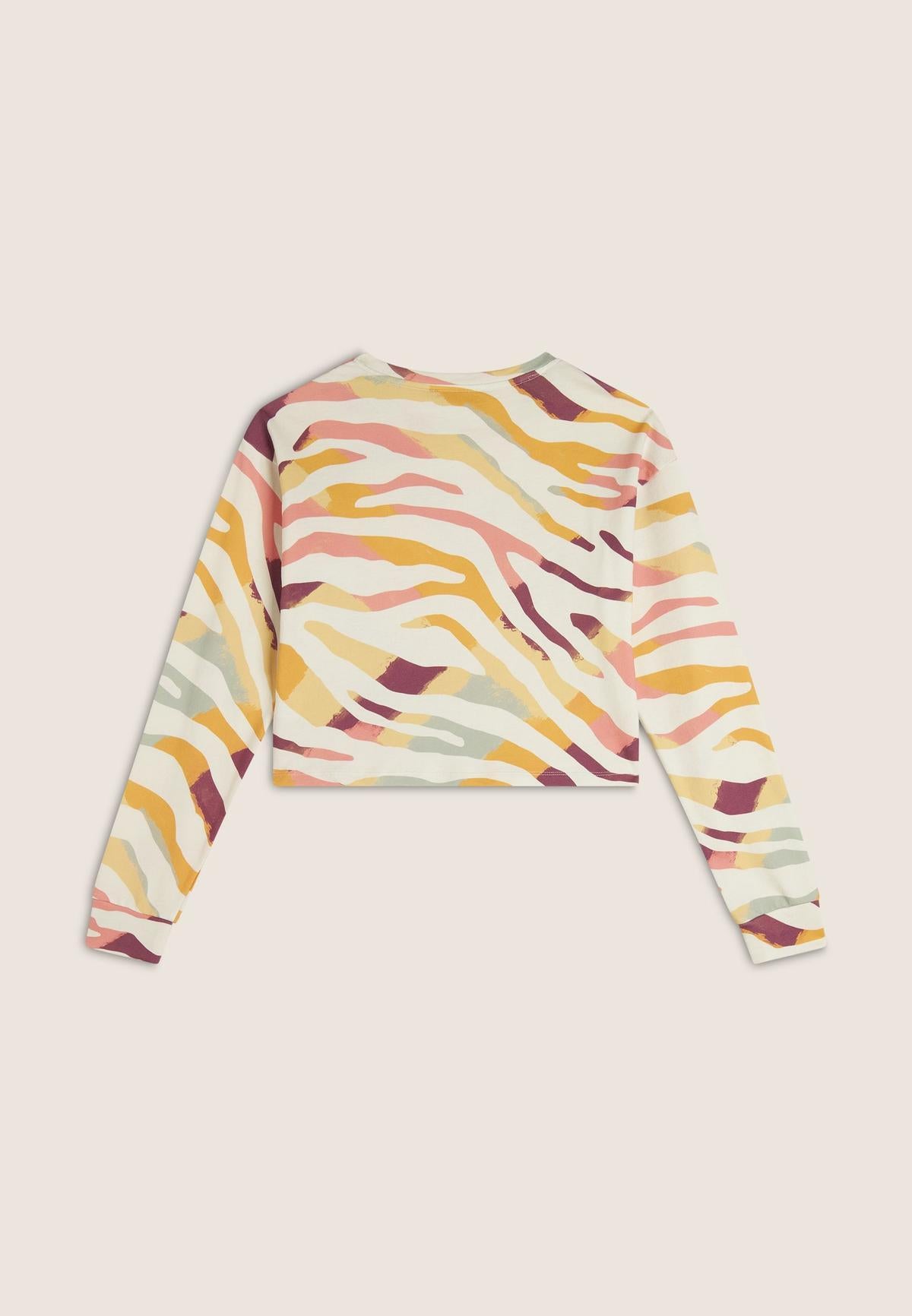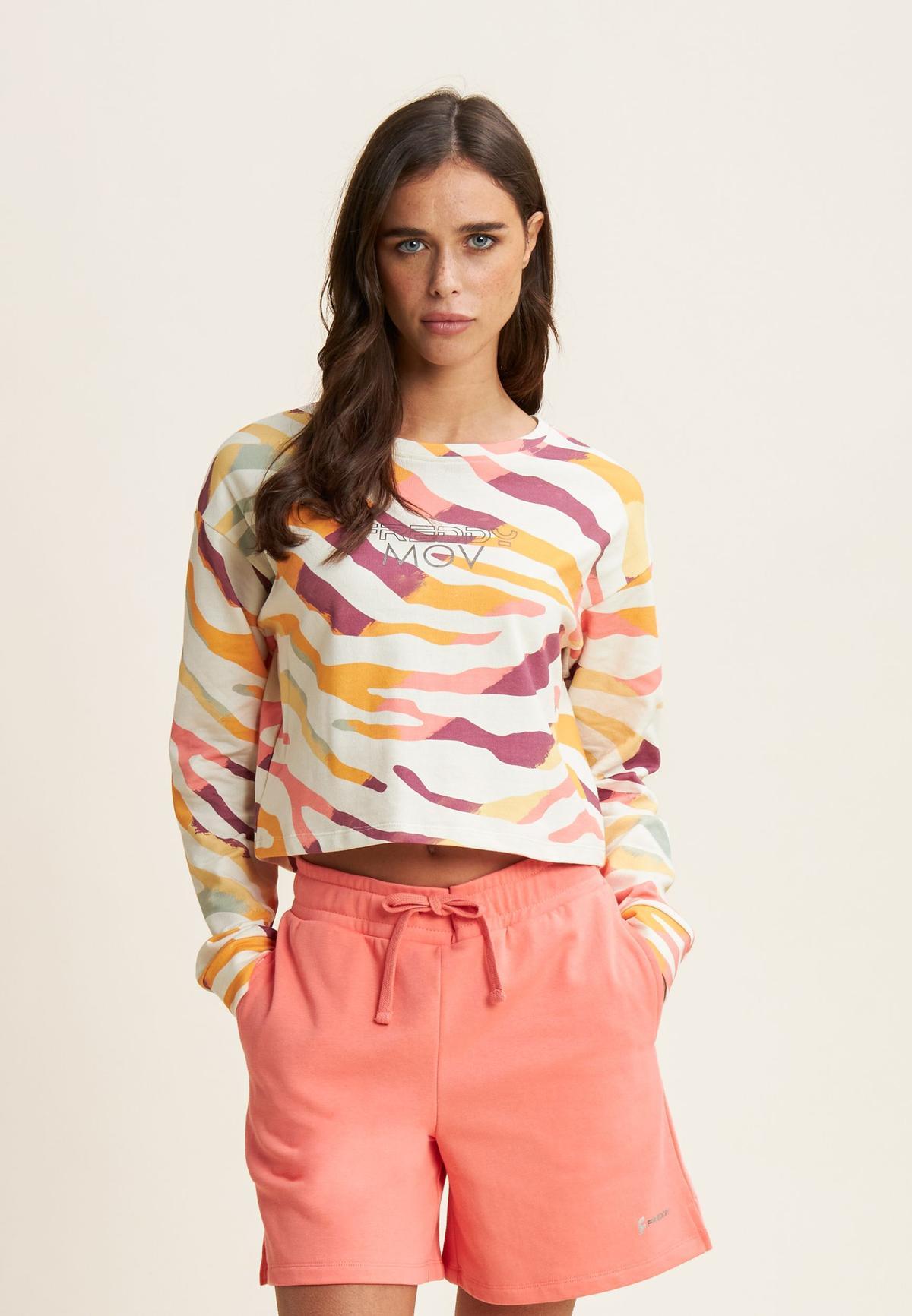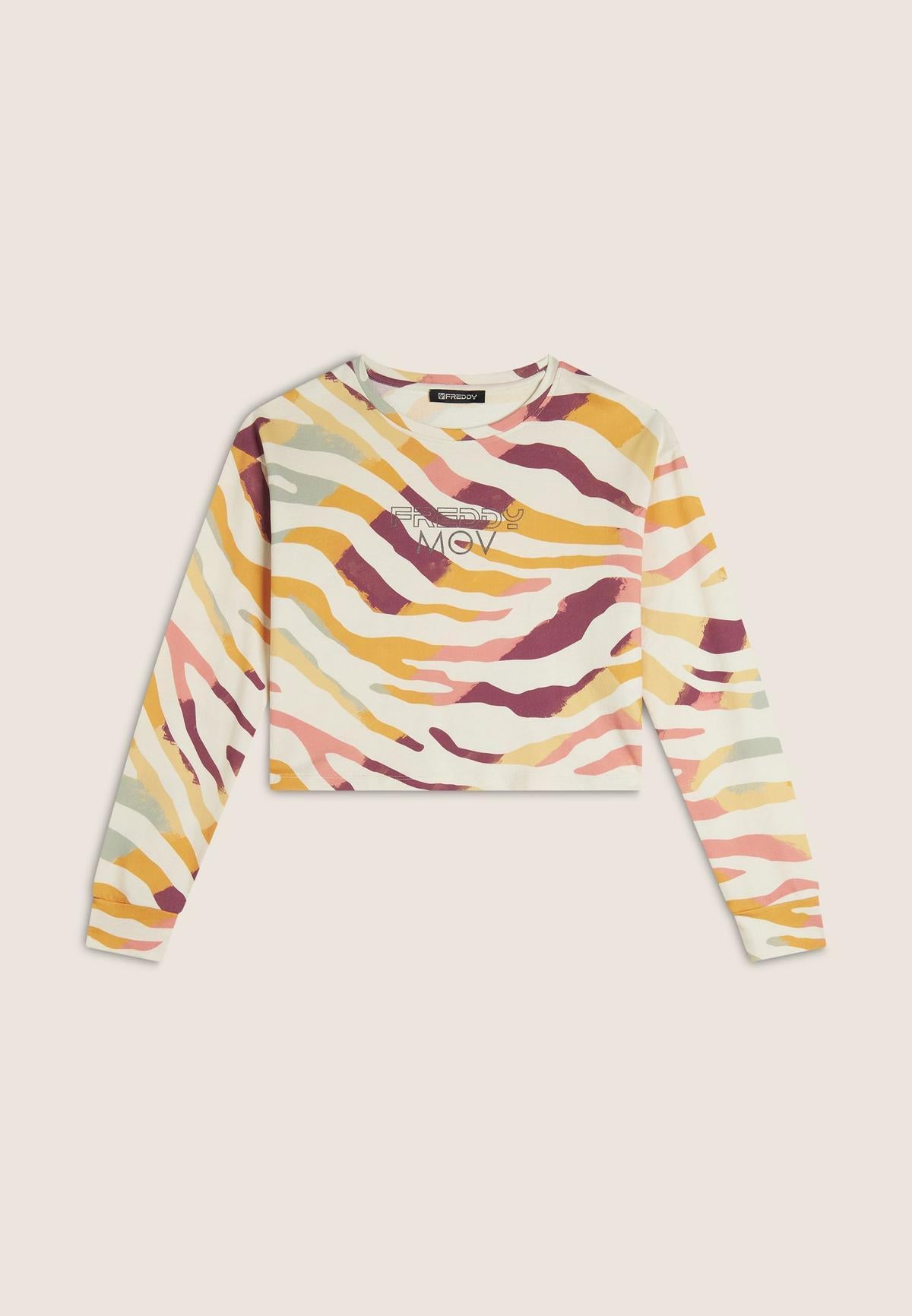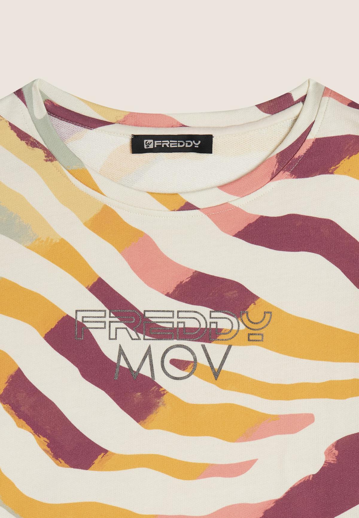 Esprimi il tuo stile con questa felpa cropped in tessuto stretch garzato dalla fantasia zebrata multicolore. Il comfort fit e il fondo dritto garantiscono una vestibilità perfetta. Il design è completato da maniche lunghe con polsino e scollo girocollo. Il dettaglio della stampa metallizzata FREDDY MOV al centro aggiunge un tocco glamour al tuo outfit.