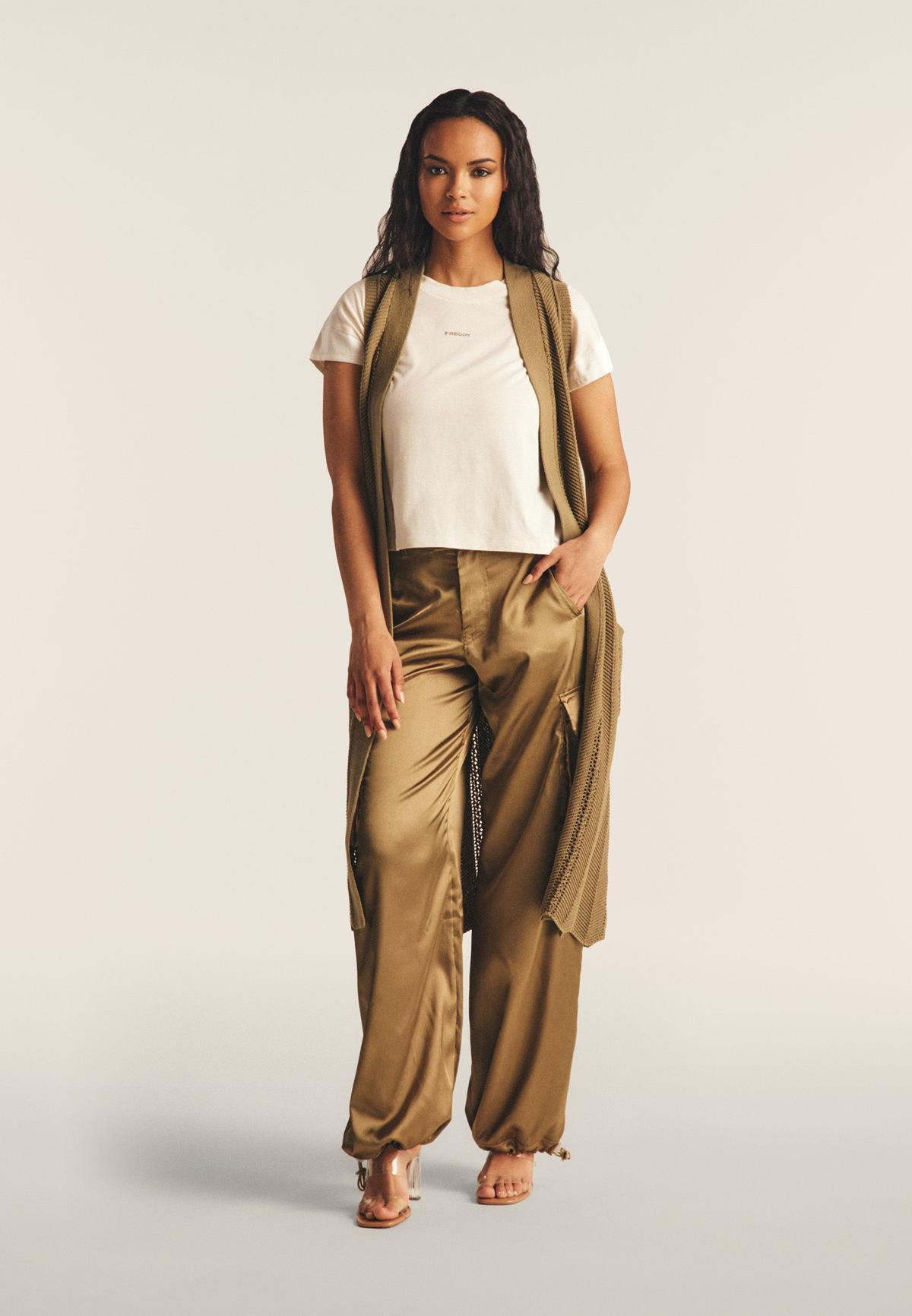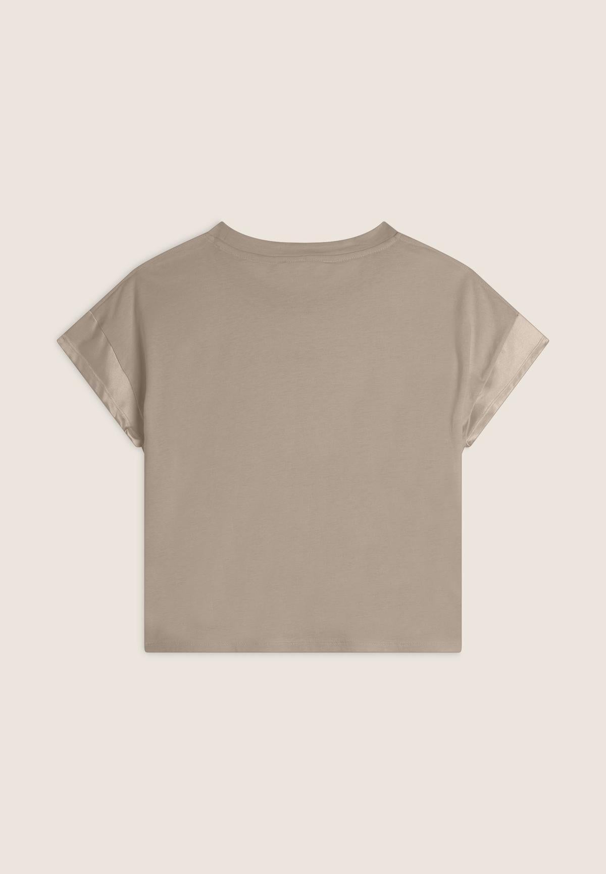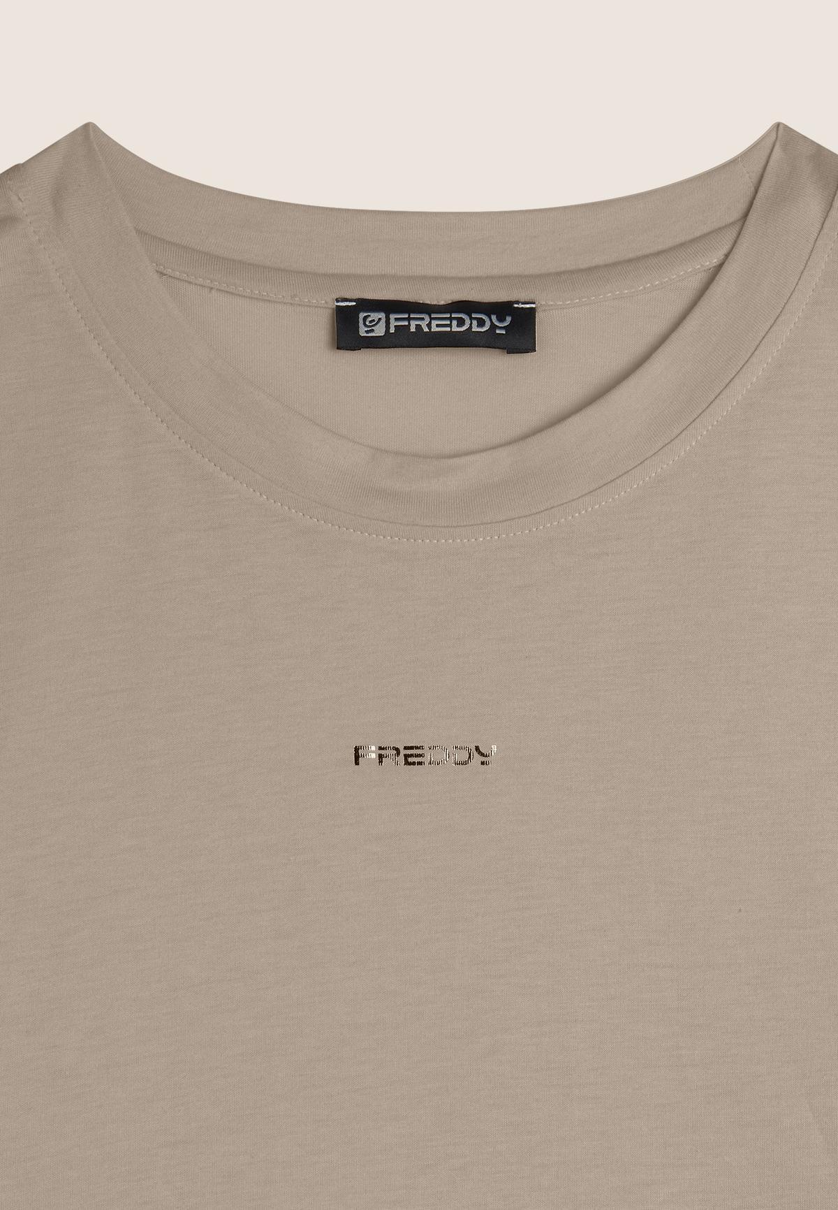 T-shirt cropped dal design fresco e minimalista. Realizzata in jersey leggero con fondo dritto, ha maniche corte in tessuto effetto seta per un tocco elegante. Lo scollo girocollo classico e il piccolo logo FREDDY oro chiaro sotto allo scollo valorizzano il look.
