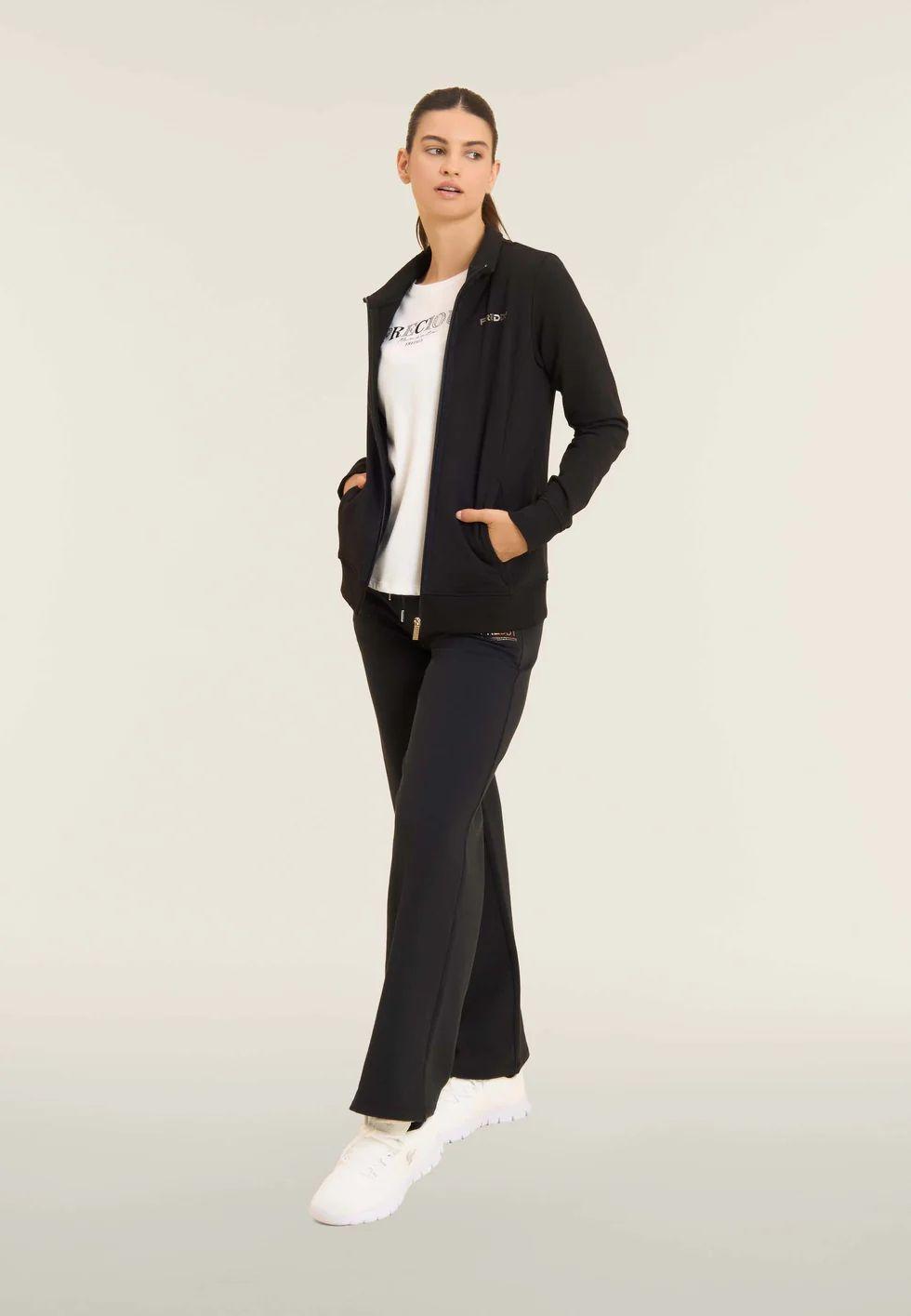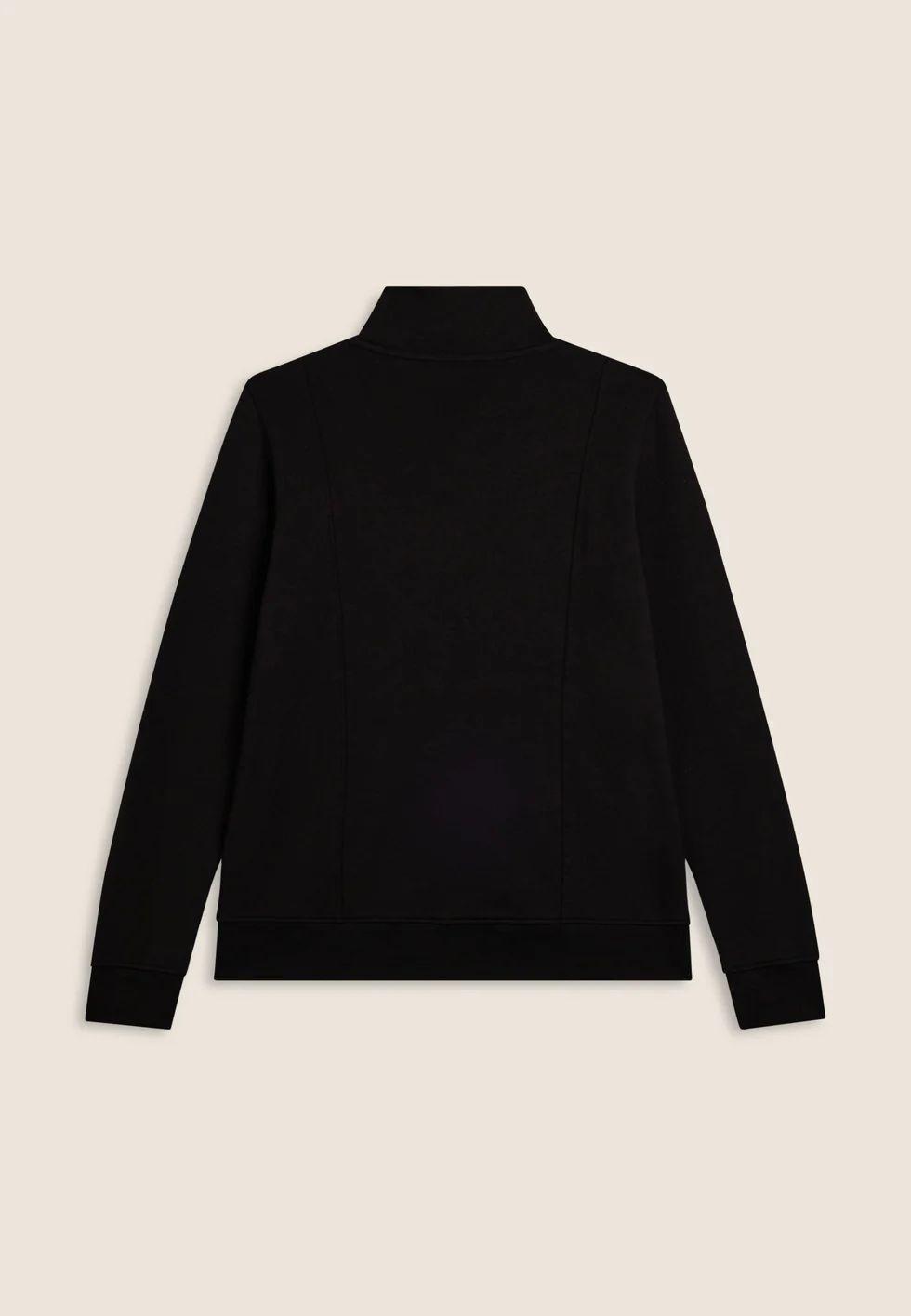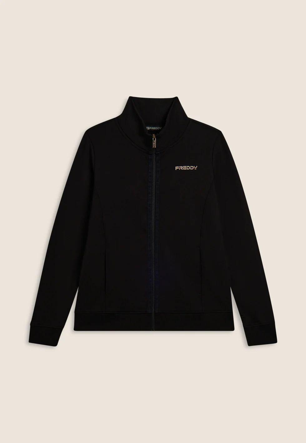 Felpa da donna in felpa garzata elasticizzata, dalla vestibilità regular, con chiusura full zip e collo alto. Le maniche sono rifinite con polsini, mentre un piccolo logo FREDDY sul cuore conferisce un look essenziale e pulito. Completano il capo le tasche interne laterali e il fondo rifinito in costina.